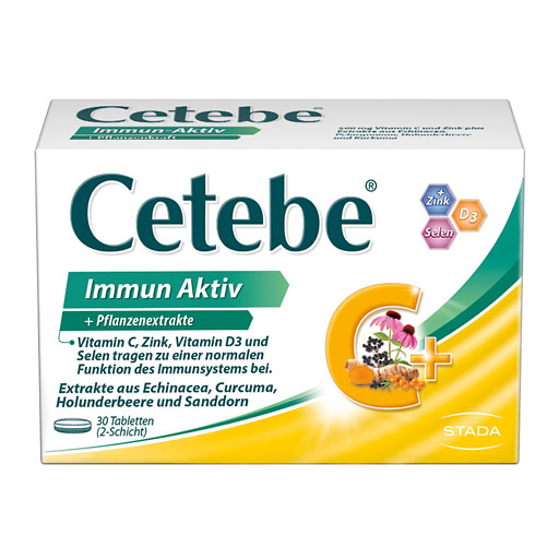 Ob in der Erkältungszeit, bei Stress oder starker körperlicher Belastung – es gibt Zeiten, in denen Ihre Abwehrkräfte besonders gefordert sind. Unser Immunsystem ist entscheidend für unsere Gesundheit, denn es schützt uns vor Infekten. Cetebe® Immun Aktiv unterstützt besonders in diesen Zeiten Ihre Abwehrkräfte durch die wertvolle Kombination aus essenziellen Vitaminen und Mineralstoffen (Vitamin C, D3, Zink und Selen) sowie ausgesuchten Pflanzenextrakten aus Echinacea, Curcuma, Holunderbeere und Sanddorn.