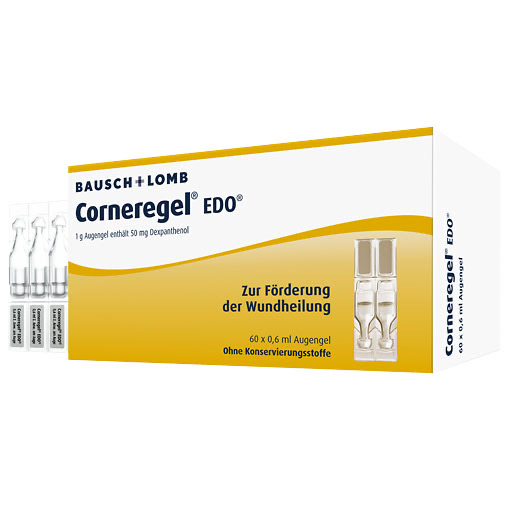 Anwendungsgebiete: Zur Behandlung nichtentzündlicher Hornhauterkrankungen des Auges (Keratopathien), z. B. Hornhautdystrophien (Ernäh- rungsstörungen), Hornhautdegenerationen (Rückbildungen), wiederkehrende Hornhauterosionen (Abschilferungen) und Hornhautläsionen (Verletzungen) bei Kontaktlinsenträgern; als zusätzliche Medikation zur Unterstützung des Heilungsverlaufs bei Hornhaut- und Bindehautschädigung, Verätzung und Verbrennung. Corneregel® EDO® ist nicht geeignet zur Heilung infektiöser Hornhautprozesse bakteriellen, viralen oder mykotischen Ursprungs, sondern nur als zusätzliche Medikation zu einer spezifischen Therapie dieser Hornhauterkrankungen.