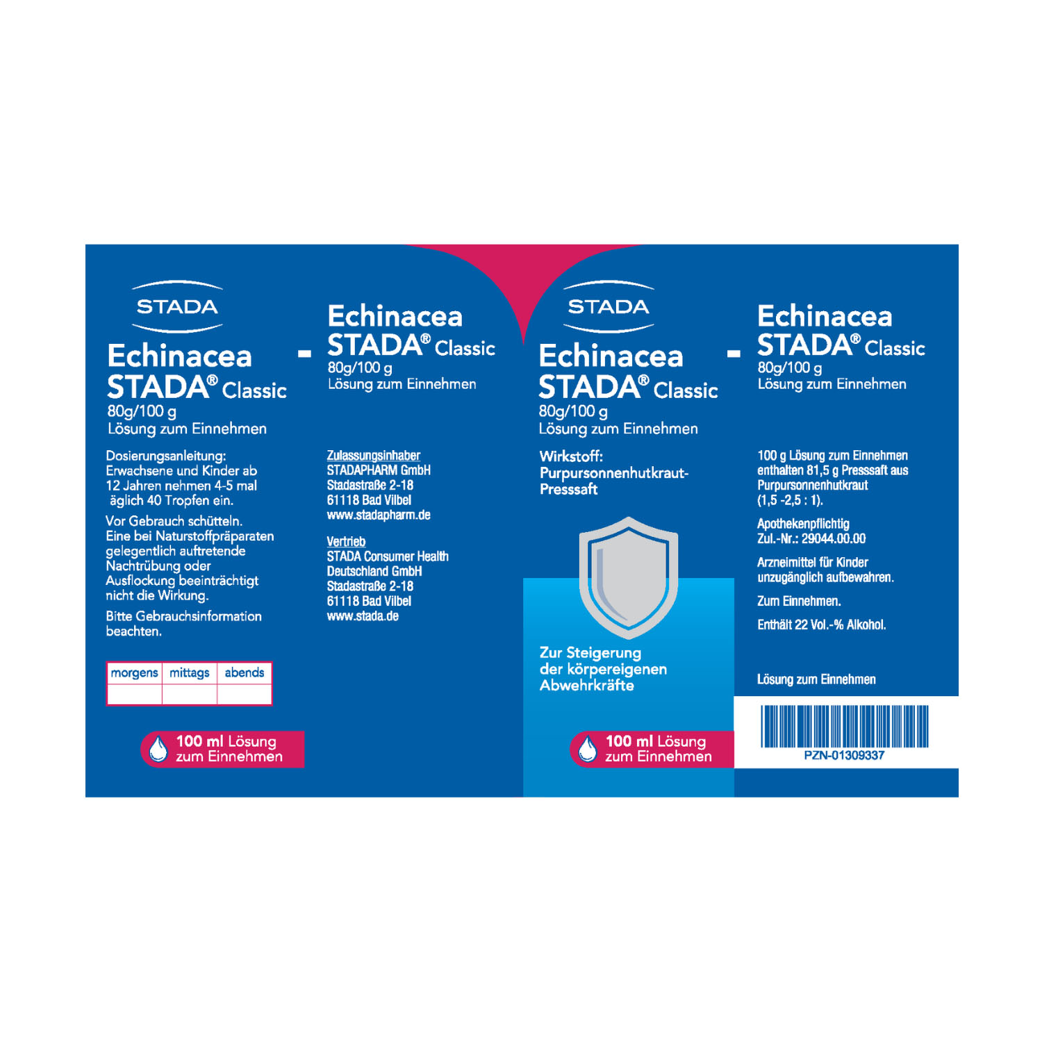 Erwachsene und Kinder ab 12 Jahren nehmen 4 bis 5-mal täglich 40 Tropfen ein. Die Lösung kann unverdünnt oder in Flüssigkeit eingenom- men werden. Vor Gebrauch schütteln. Eine bei Naturstoffpräparaten gelegentlich auftretende Nachtrübung oder Ausflockung beeinträch- tigt nicht die Wirkung. Bei der Einnahme von Echinacea STADA® Classic muss beachtet werden, dass die Lösung 22 Vol.-% Alkohol enthält.