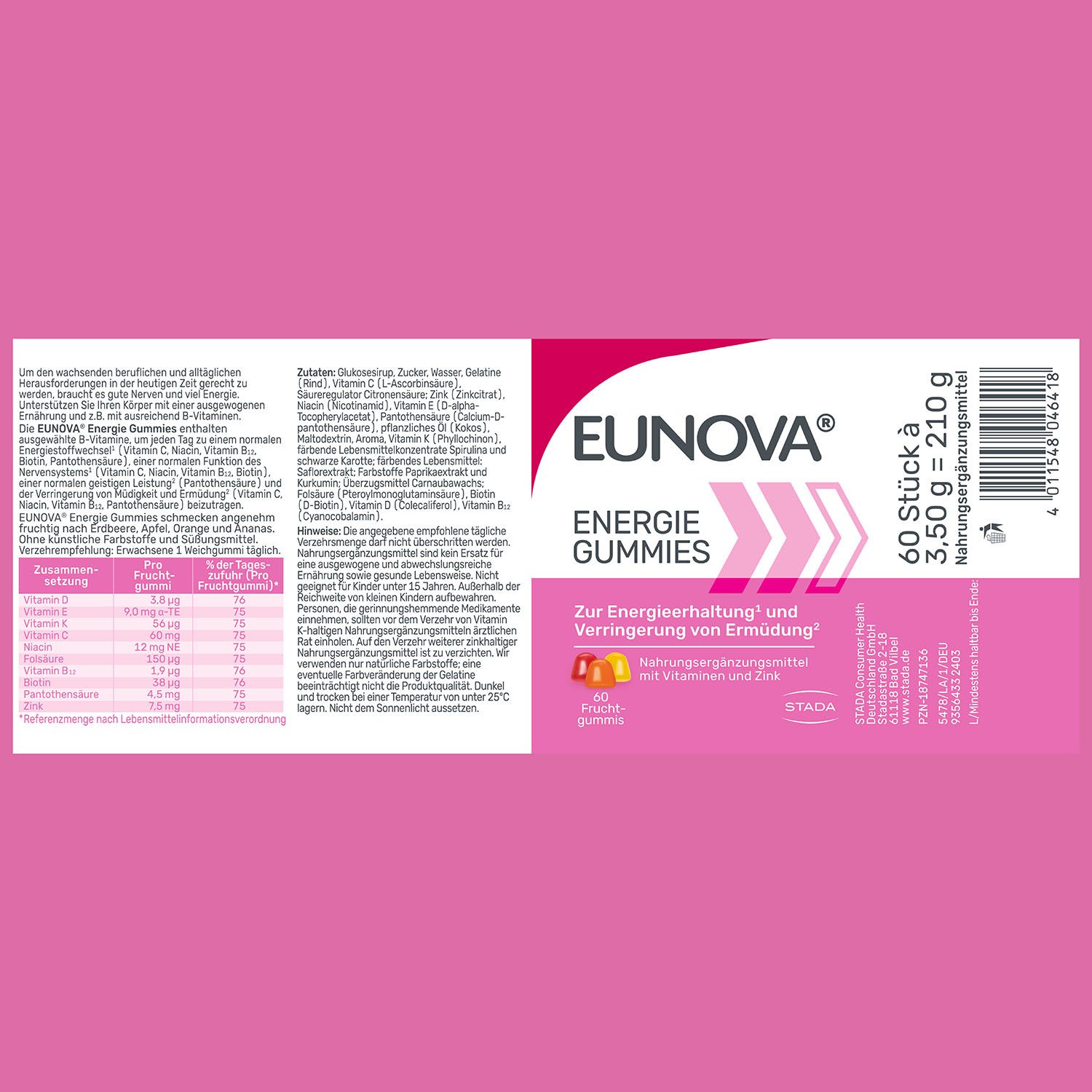 Laut der nationalen Verzehrstudie3 sind einige Erwachsene nicht optimal mit allen Nährstoffen versorgt. Bereits ein Gummi täglich unterstützt den Energiestoffwechsel und unterstützt Sie dabei, im Job und im Alltag leistungsfähiger zu sein. Dabei legen besonders Menschen mit einem aktiven Lebensstil besonderen Wert darauf, umfassend versorgt zu sein. Mit EUNOVA® Energie Gummies können Sie Ihre Extra-Portion Vitamine ganz einfach und lecker naschen. Die sorgfältig dosierten Inhaltsstoffe sind auf die Bedürfnisse von Erwachsenen und Jugendlichen abgestimmt und ergänzen eine gesunde Ernährung. So genießen Sie jeden Tag energiereich.