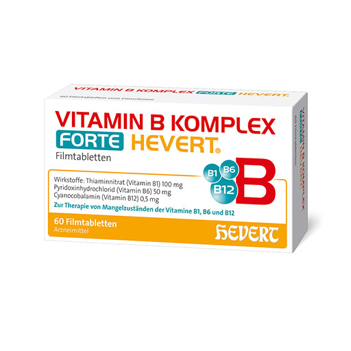 Das rezeptfreie, apothekenpflichtige Arzneimittel Vitamin B Komplex forte Hevert versorgt den Körper schnell und hochdosiert mit B-Vitaminen und lindert Symptome eines Vitamin B-Mangels, zum Beispiel Kribbeln, Brennen, Taubheitsgefühle oder Schmerzen in Händen und Füßen bei Neuropathien. Auch bei chronischen Schmerzen im Bewegungsapparat, können B-Vitamine die Nervenfunktion verbessern und so Beschwerden reduzieren.